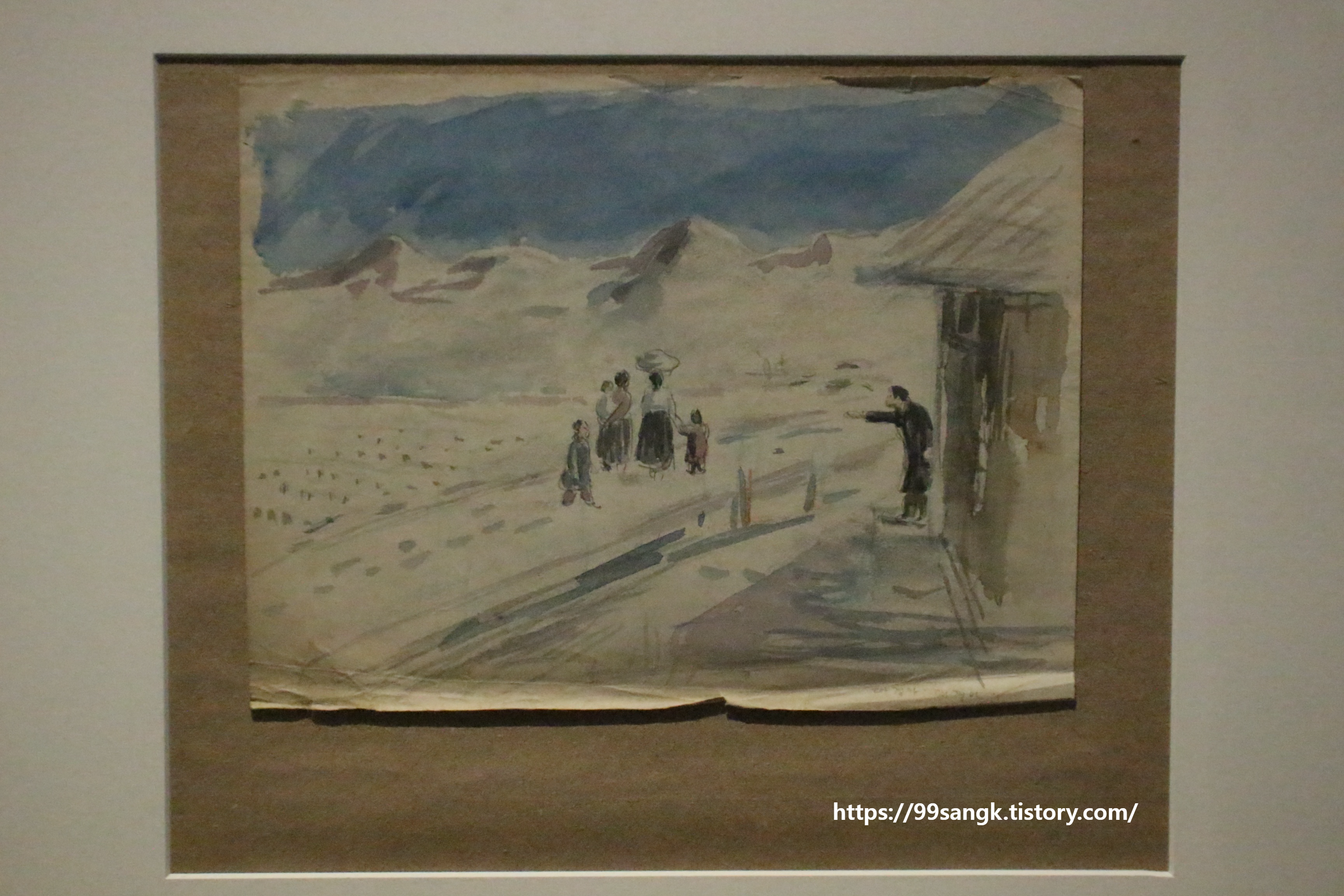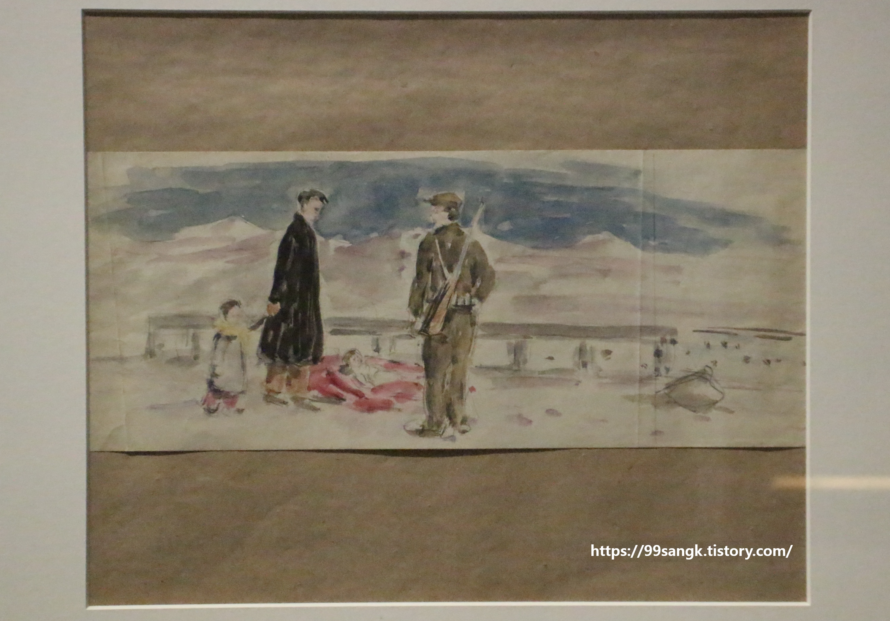 < 전쟁드로잉> _ 윤중식(尹仲植, 1913~2012, 평양출신), 1951, 종이에 수채, 크레용 등, 17.8×32cm, 성북구립미술관