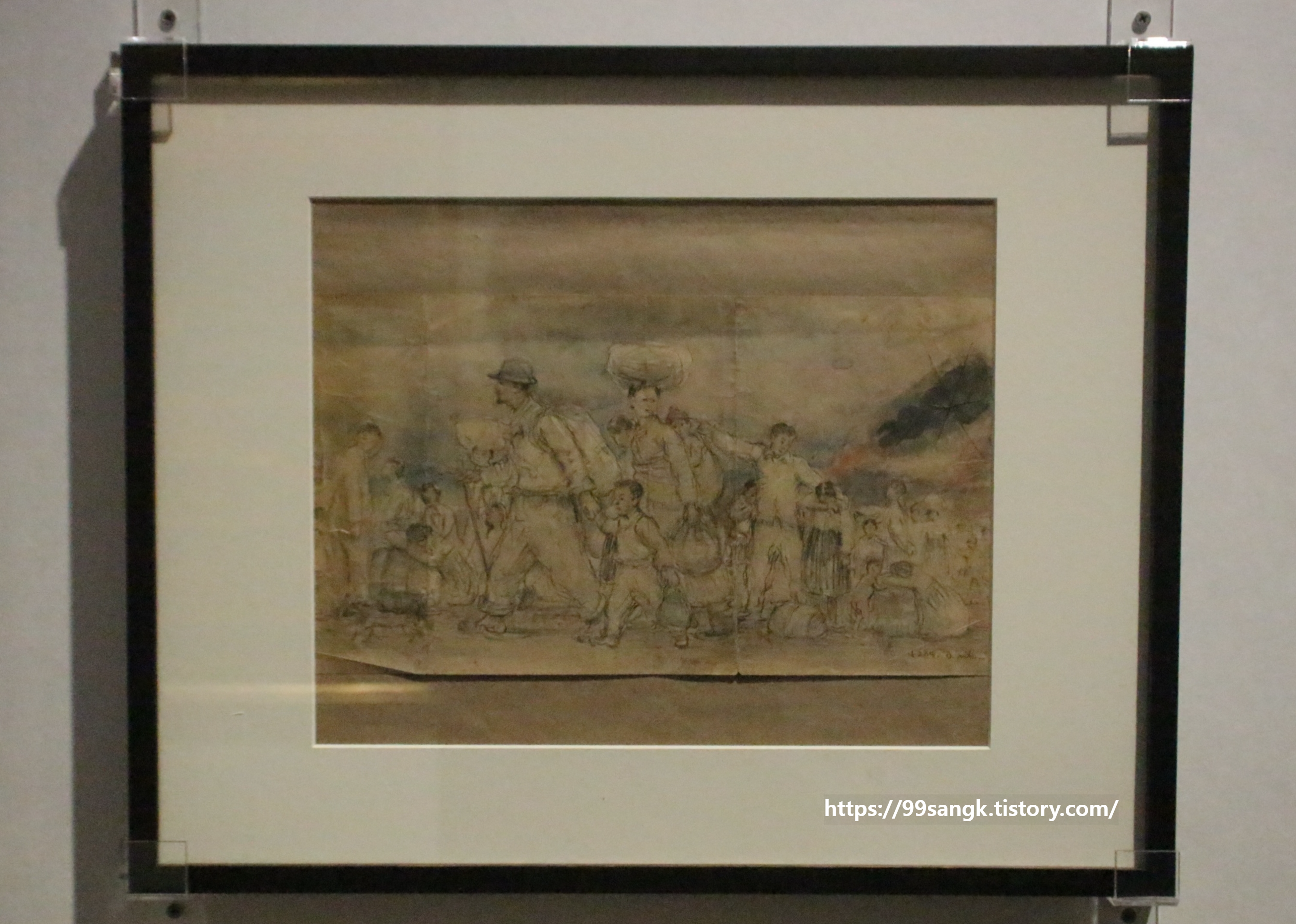 윤중식은 6.25전쟁 당시 피란 도중 아내와 큰딸을 잃고 젖먹이 막내딸마저 영양실조로 잃는 비국을 겪었다. 부산에 도착한 후 종이와 물감을 구해 고통과 참상을 화폭에 담았고, ,전쟁드로잉>은 그가 아들과 함께 공습을 피해 도망치던 순간을 포착한 것이다