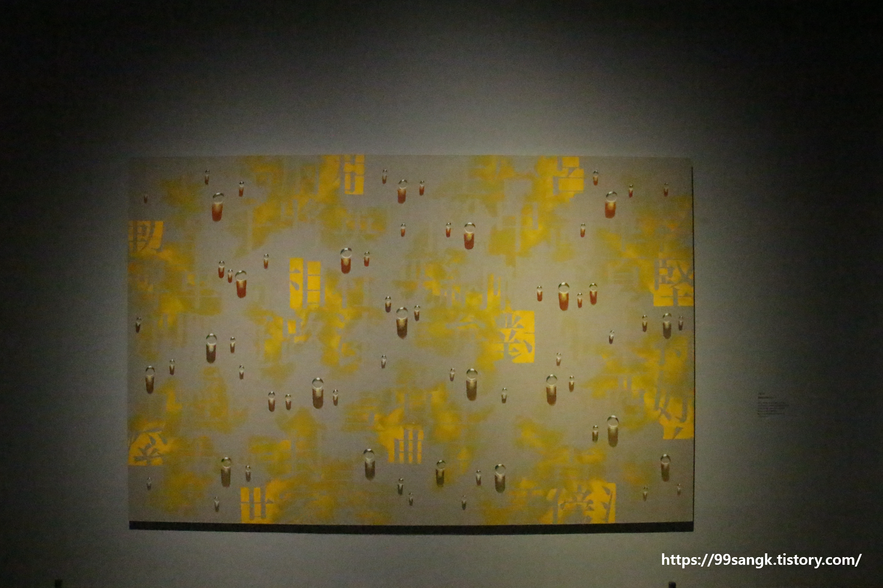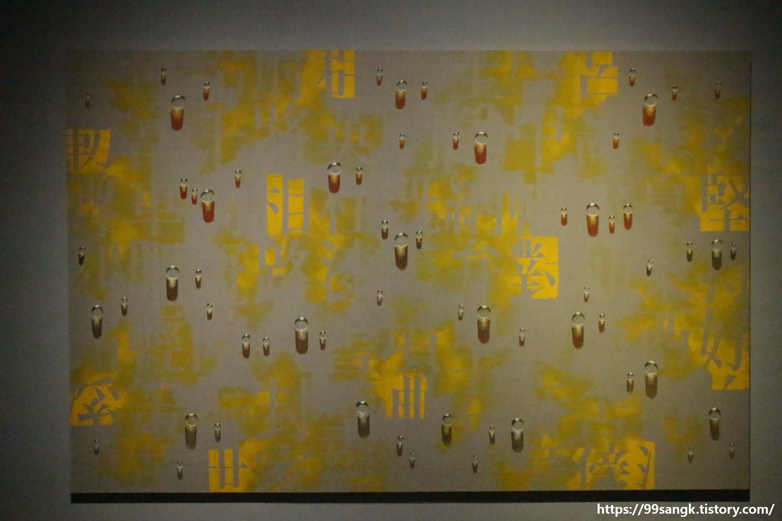 <회귀> _ 김창열(金昌烈, 1929~2021, 평안남도 맹산군), 2012, 마포에 아크릴릭 물감, 유화 물감, 195×300cm, 제주도립김창열미술관 소장