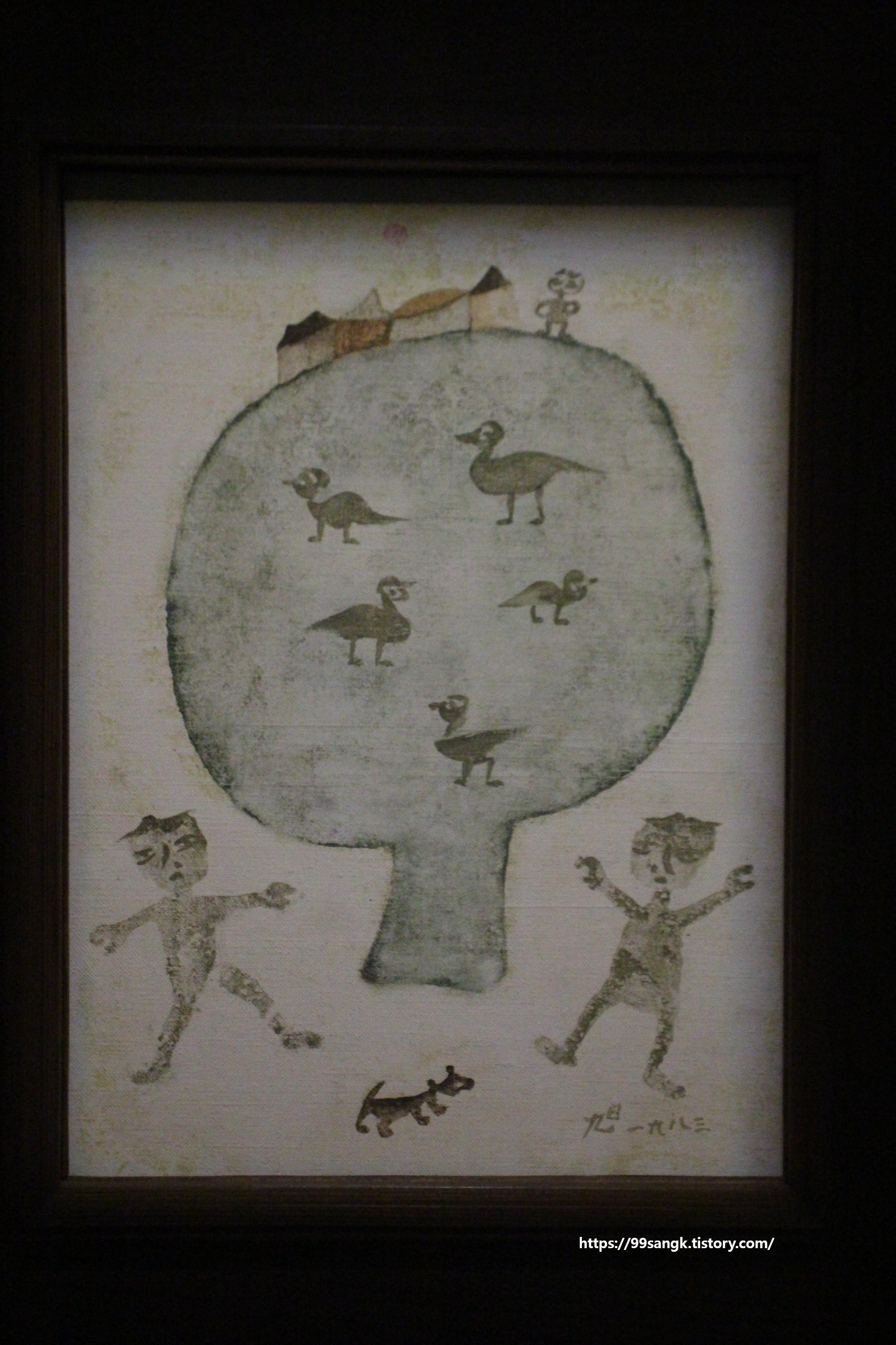 <새와 아이들>은 장욱진이 수안보에 거주하던 시기에 제작한 작품으로 이 시기에 등장하는 수묵화적 경향을 잘 드러난다.