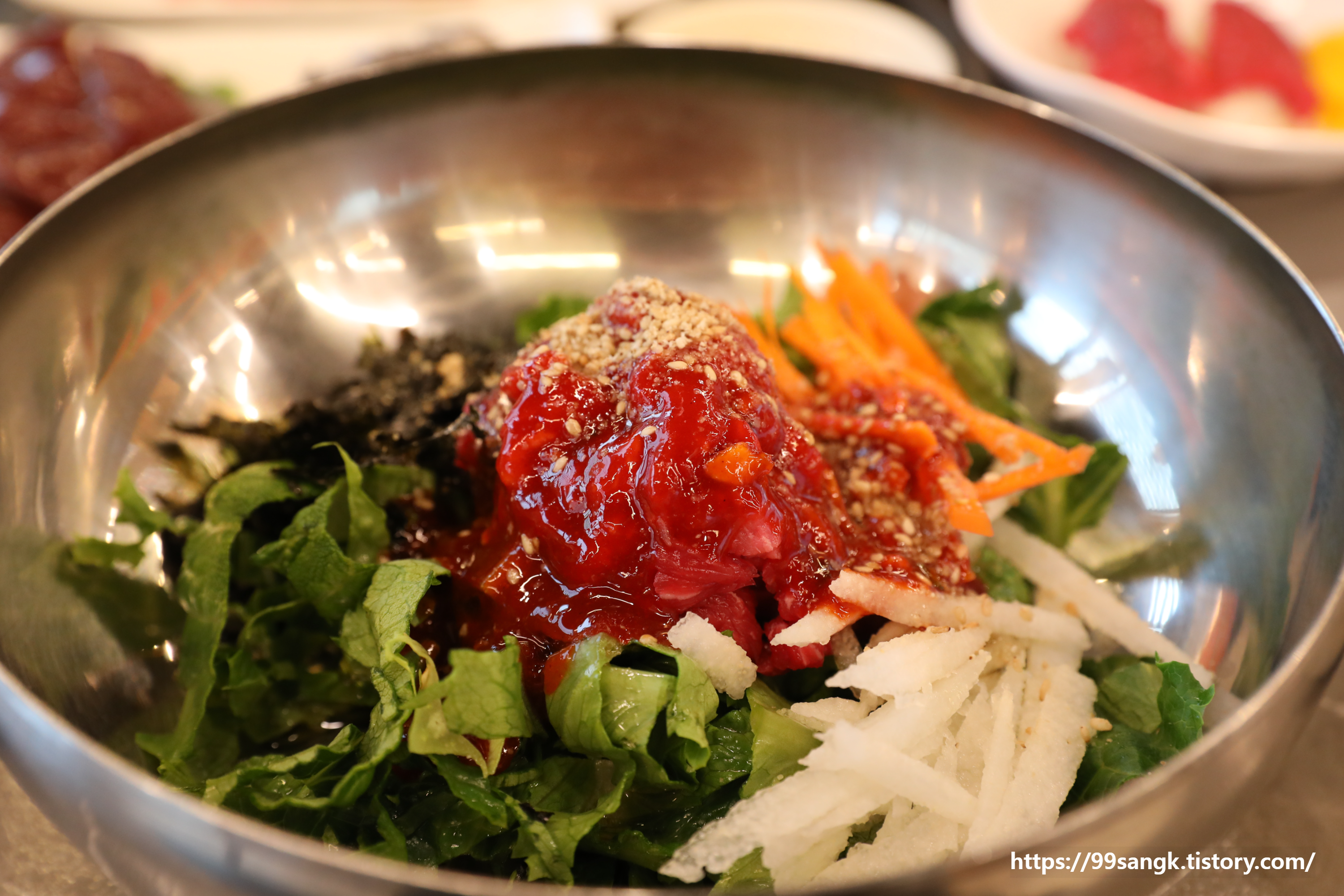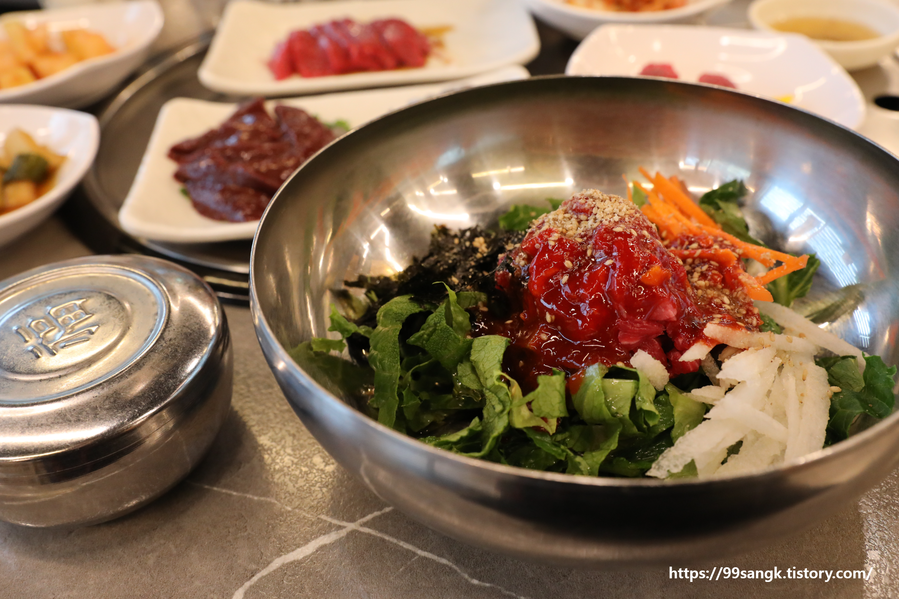 오늘의 메인 요리인 골드한우식당 육회비빔밥(13,000원)