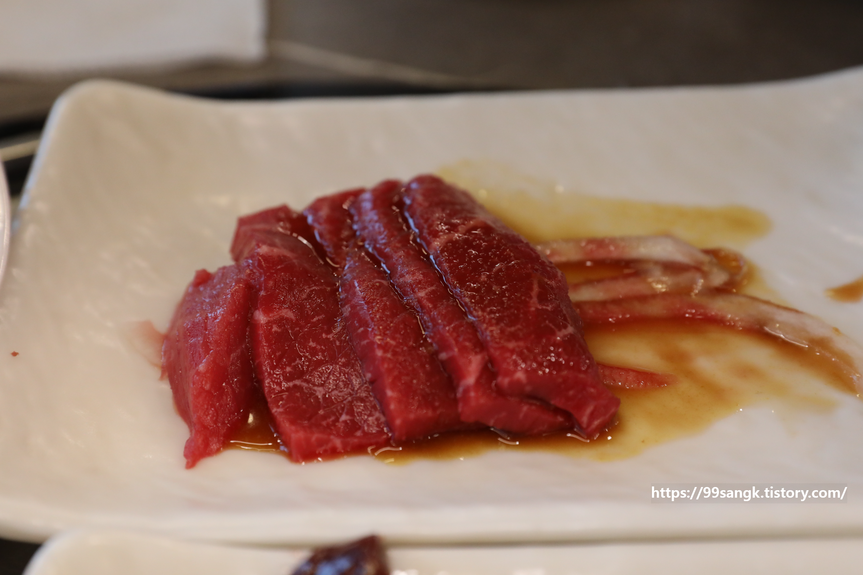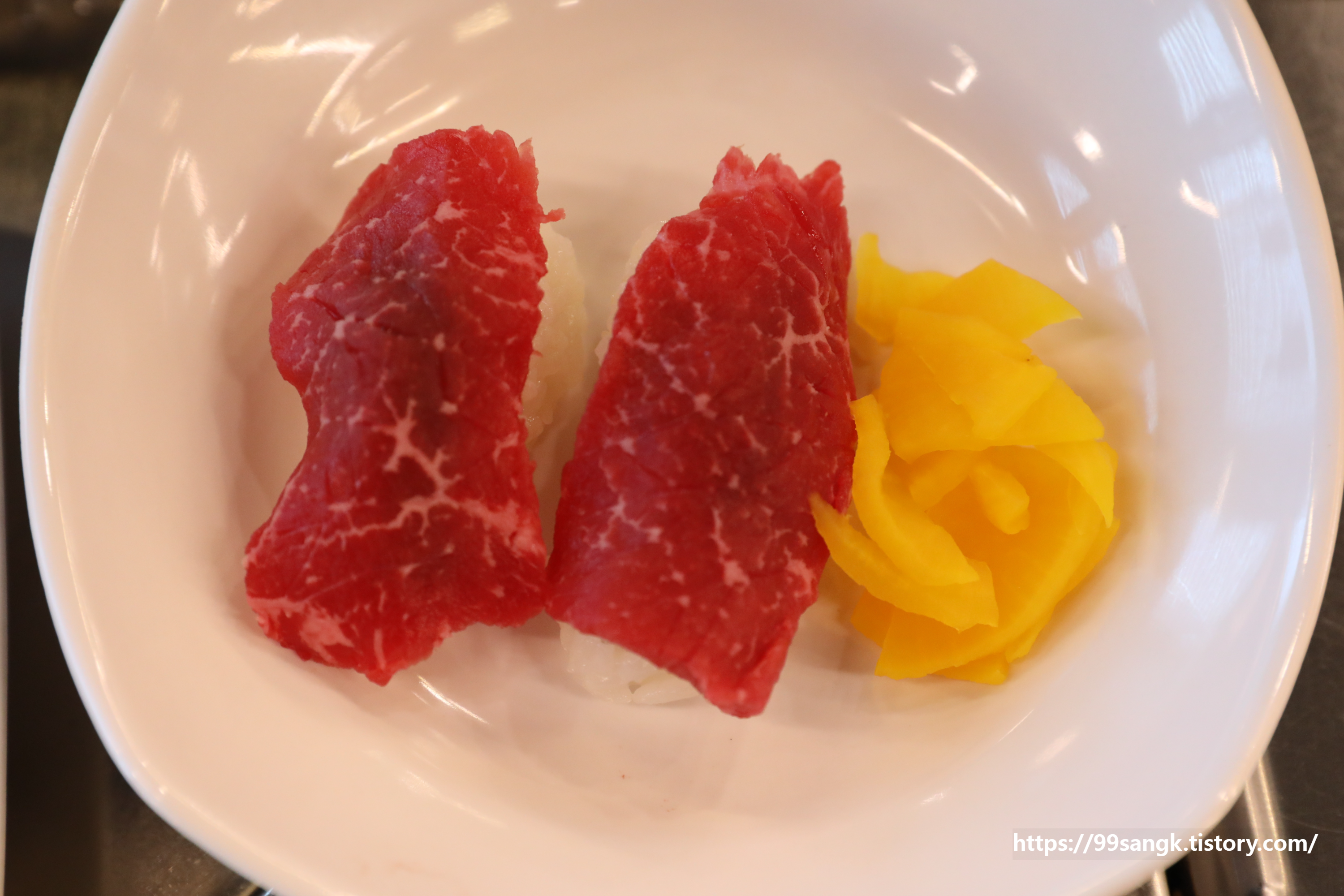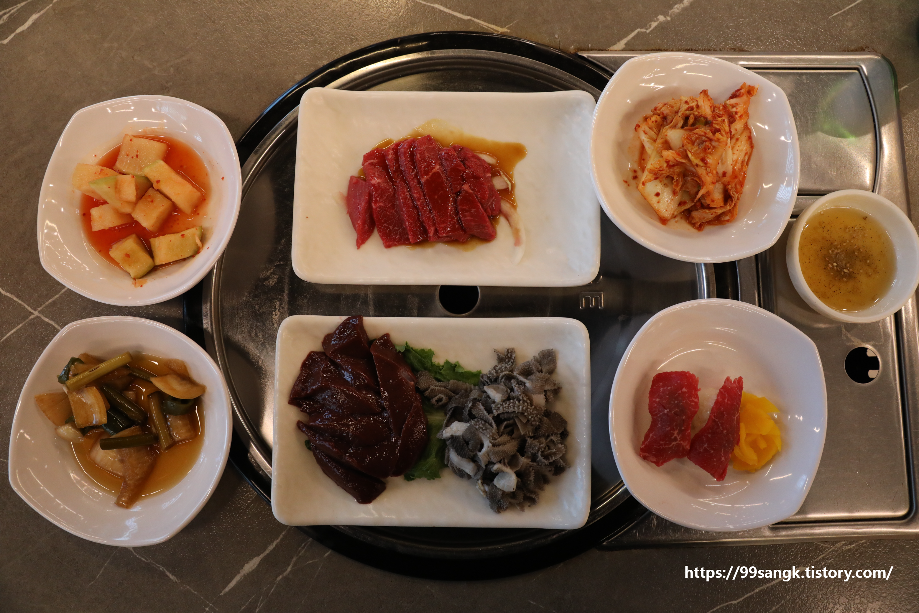 반찬에는 김치, 깍두기, 양파장아찌, 육회, 한우 초밥, 간 · 천엽이 나왔습니다,
