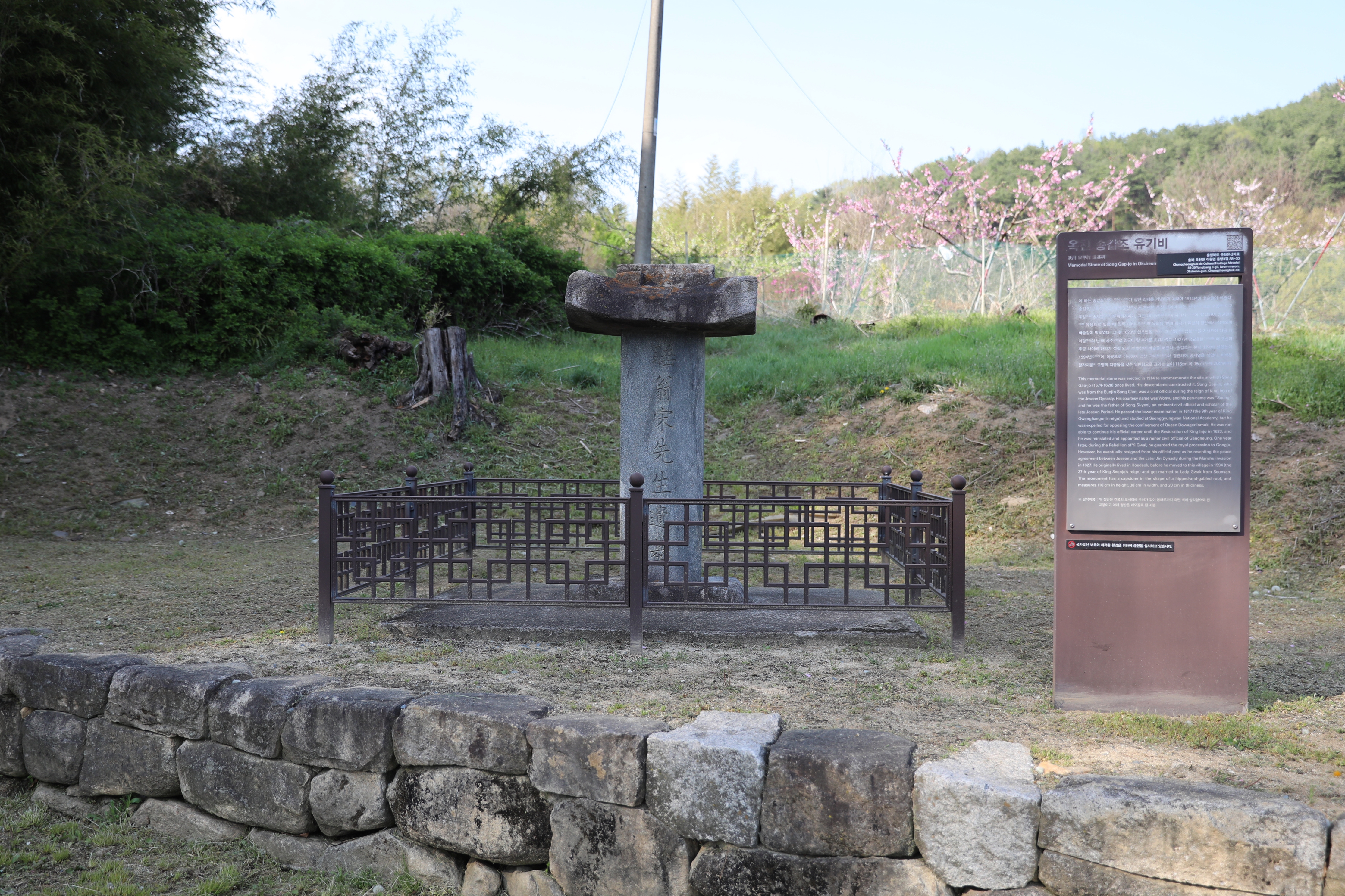 충청북도 문화재자료 제55호 _ 옥천 송갑조 유기비 (沃川 宋甲祚 遺基碑)수 량 : 1기지정일 : 2006.04.07소재지 : 충청북도 옥천군 이원면 용방3길 88-30이 비는 송갑조( 宋甲祚, 1574-1628)가 살던 집터를 기념하기 위하여 1914년에 후손들이 세웠다. 송갑조는 조선 인조 때의 문신으로서 본관은 은진이며 자는 원유元裕 호는 수옹遁翁이고 우암 송시열의 아버지이다. 그는 1617년(광해군 9)에 사마시에 합격하여 성균관 유생으로 있을 때 인목 대비의 유폐를 반대 하다가 유생의 명단에서 삭제되어 벼슬길이 막히었다. 그 후 1623년 인조반정(仁祖反正)때 강릉 참봉을 지냈으며 다음 해 이괄의 난 때 공주(公州)로 임금이 탄 수레를 호위하였고, 1627년 정묘호란 때 조선과 후금 사이..